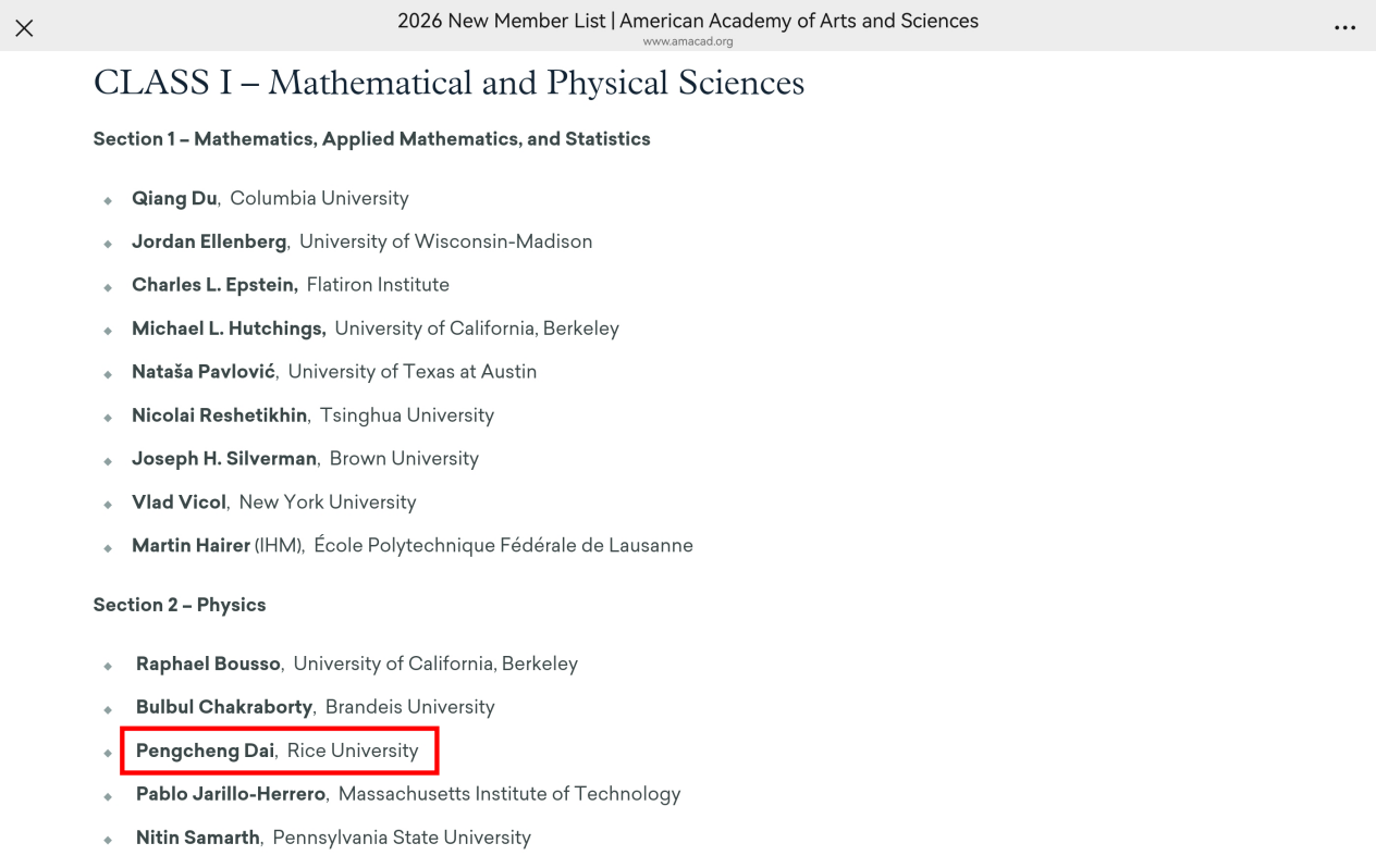 近日,美国艺术与科学院(The American Academy of Arts and Sciences,简称AAAS)公布2026年度新增院士名单。bat365在线中国官网登录入口物理学院1980级校友、美国莱斯大学物理与天文系Sam and Helen Worden讲席教授戴鹏程,凭借在实验凝聚态物理领域的杰出贡献,成功当选数学与物理科学类别院士。这一荣誉是国际学术界对其卓越学术成就的高度认可,也是我校人才培养与学科建设取得的又一标志性成果。