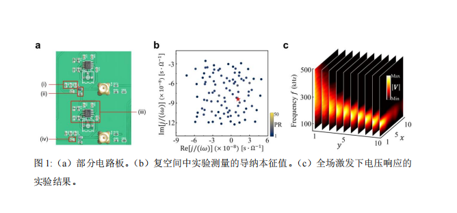 为此,文章在经典电路的实验中首次观察到了非厄米连续朗道模。图1(a)给出了设计的电路图。在该电路图中,实现连续朗道模所需的非厄米Dirac哈密顿量通过负阻抗转换器模拟的非互易耦合构建,而赝磁场则通过位置相关的电容和电阻模拟的非均匀复在位能调控。通过测量电路系统的导纳本征值和本征态,观察到了连续朗道模的关键特性—弥散的复能谱分布及局域的本征态(图b)。而且,在全场激发下观测到了彩虹陷阱和波漏斗的奇异电压响应行为(图c),这种响应来源于连续朗道模的局域中心位置与复本征值之间的线性关系。该工作在非厄米和磁场之间架起了一座桥梁,为探索奇异的非厄米物理开辟了新的途径。