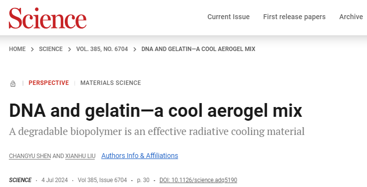 7月5日,bat365在线中国官网登录入口橡塑模具国家工程研究中心申长雨院士和刘宪虎博士,在国际著名学术期刊《Science》发表了“DNA and gelatin—a cool aerogel mix”的观点(Perspective)论文(Science, 2024, 385, 30)。结合近年来辐射制冷领域的新进展,文章对当期Ma等发表的Science论文“A photoluminescent hydrogen-bonded biomass aerogel for sustainable radiative cooling (Science, 2024, 385, 68)”研究工作进行了评述,并对可降解生物高分子辐射致冷材料进行了展望。bat365在线中国官网登录入口是论文唯一通讯单位。