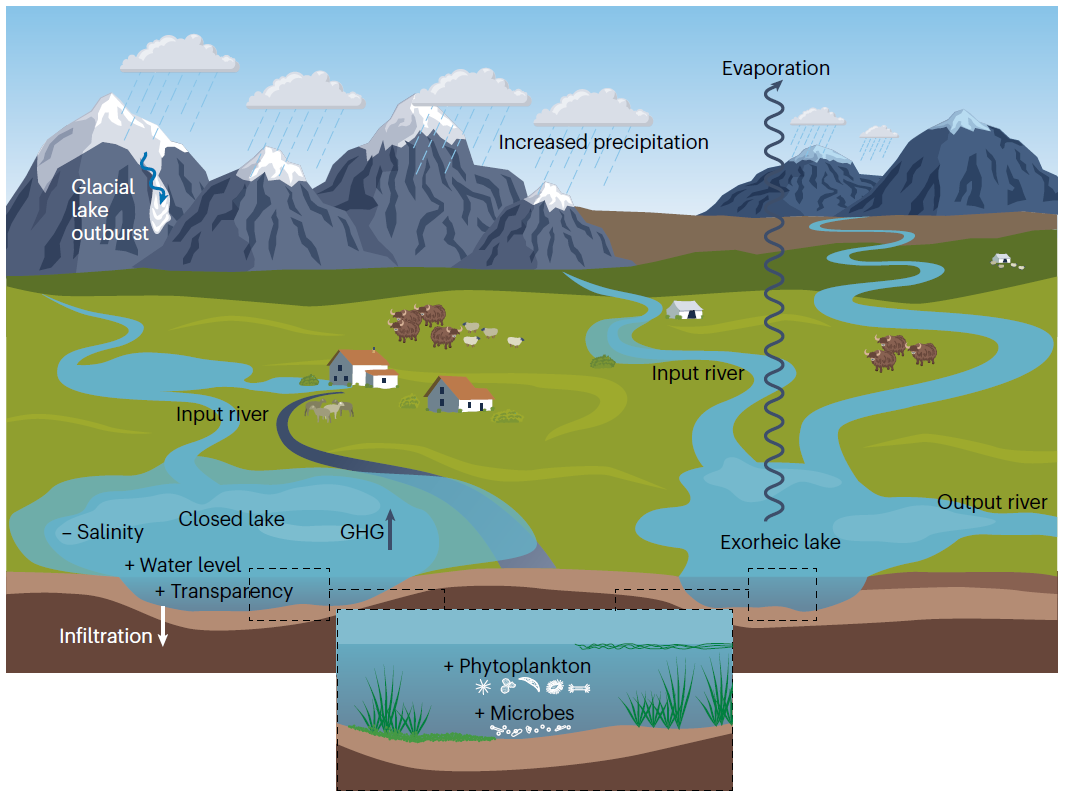 为全面研究青藏高原湖泊对气候变化的响应和影响,bat365在线中国官网登录入口地球科学与技术学院副教授乔宝晋与中国科学院青藏高原研究所研究员朱立平团队合作,通过大量的实地调查和遥感反演分析发现,随着气候变暖,青藏高原湖泊的规模、物理和生物地球化学特征发生了明显的变化。自1995年以来,湖泊面积和体积持续增加,北部湖泊扩张最快,大中型湖泊(≥10 km2)平均地表温度快速升高。水体平均透明度增加,平均盐度下降,平均叶绿素下降,这些变化均表现为北部变化幅度高于南部。尽管外部营养成分输入仍然较少,浮游植物生产力增加有限,但湖泊生物地球化学的响应仍表现为微生物多样性和营养状况增强。虽然青藏高原的湖泊是大气CO2的源,但全年观测表明,湖泊仍可能是CO2的汇,盐度较高的湖泊比盐度较低的湖泊向大气排放的二氧化碳更强。