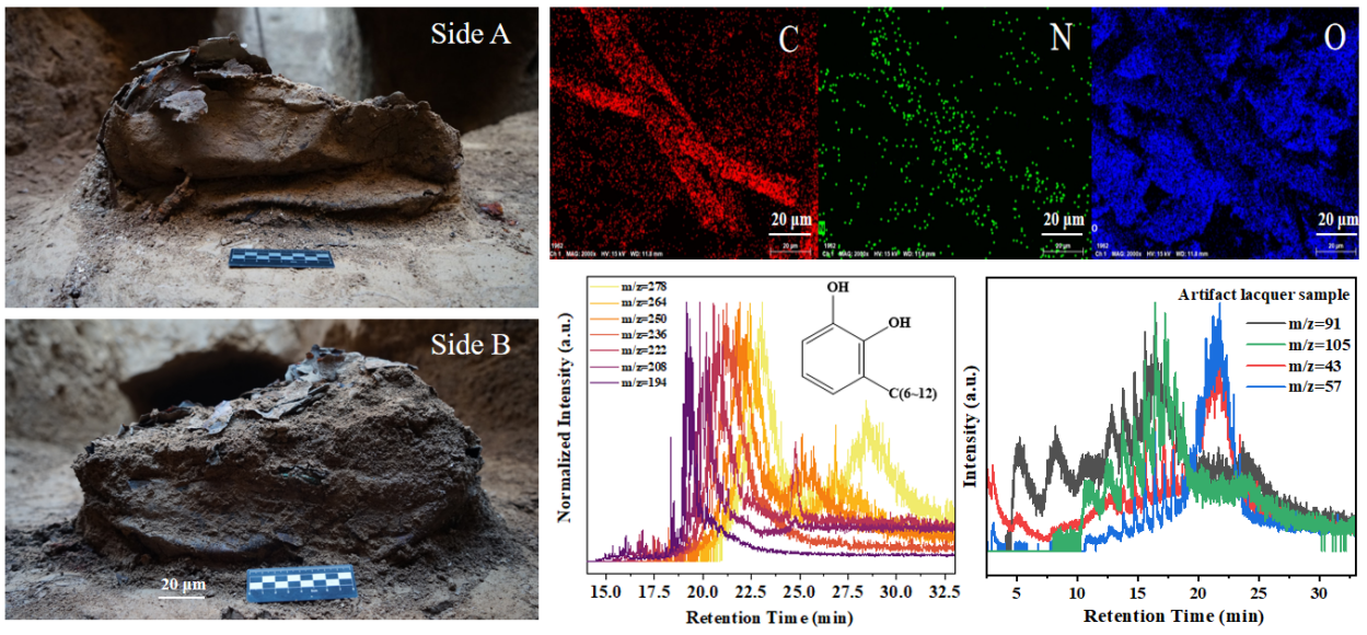 该工作以河南焦作唐代墓葬出土的一件劣化严重的漆皮文物为对象,综合运用扫描电镜—能谱分析(SEM-EDS)与热裂解气相色谱—质谱(Py-GC-MS)等技术,系统揭示了该文物的组成、结构、形貌与降解特征。结果表明,该文物为皮革基层结合天然生漆涂饰的漆皮制品,其漆膜虽已发生显著劣化,但仍保留源自中国传统漆树的典型化学结构特征。通过与现代生漆样本的对比分析,进一步确认该文物材料的原始来源与劣化程度。研究构建了“形貌—成分—结构—来源”多维识别体系,为文化遗产中复杂有机质文物的材料鉴定与工艺复原提供了新的技术路径,也有望为唐代漆皮制作工艺的历史重构与科学保护提高必要的理论参考。