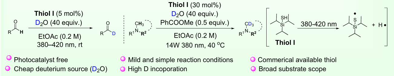 研究团队首次开发出一种无光催化剂的光催化氘代方法,打破光催化氘代体系需要光催化剂激活的传统认知。在380-420nm光照下,使用市售常见硫醇化合物作为氢原子转移(HAT)催化剂,利用重水作为氘源,成功实现甲酰基和胺α-位的高效氘代。芳香族、脂肪族和多种药物氘代衍生物的成功制备验证了该方法的广泛适用性和官能团耐受性。此外,克级放大实验、重水回收循环实验和太阳光驱动反应均揭示出该方法具有良好的工业应用前景。最后,高分辨质谱、气相色谱、EPR和DFT计算揭示出S-H键在低能量光照射下发生均裂产生硫自由基和氢自由基的独特反应机制,为无光催化剂光驱动氘代反应提供了全新思路。