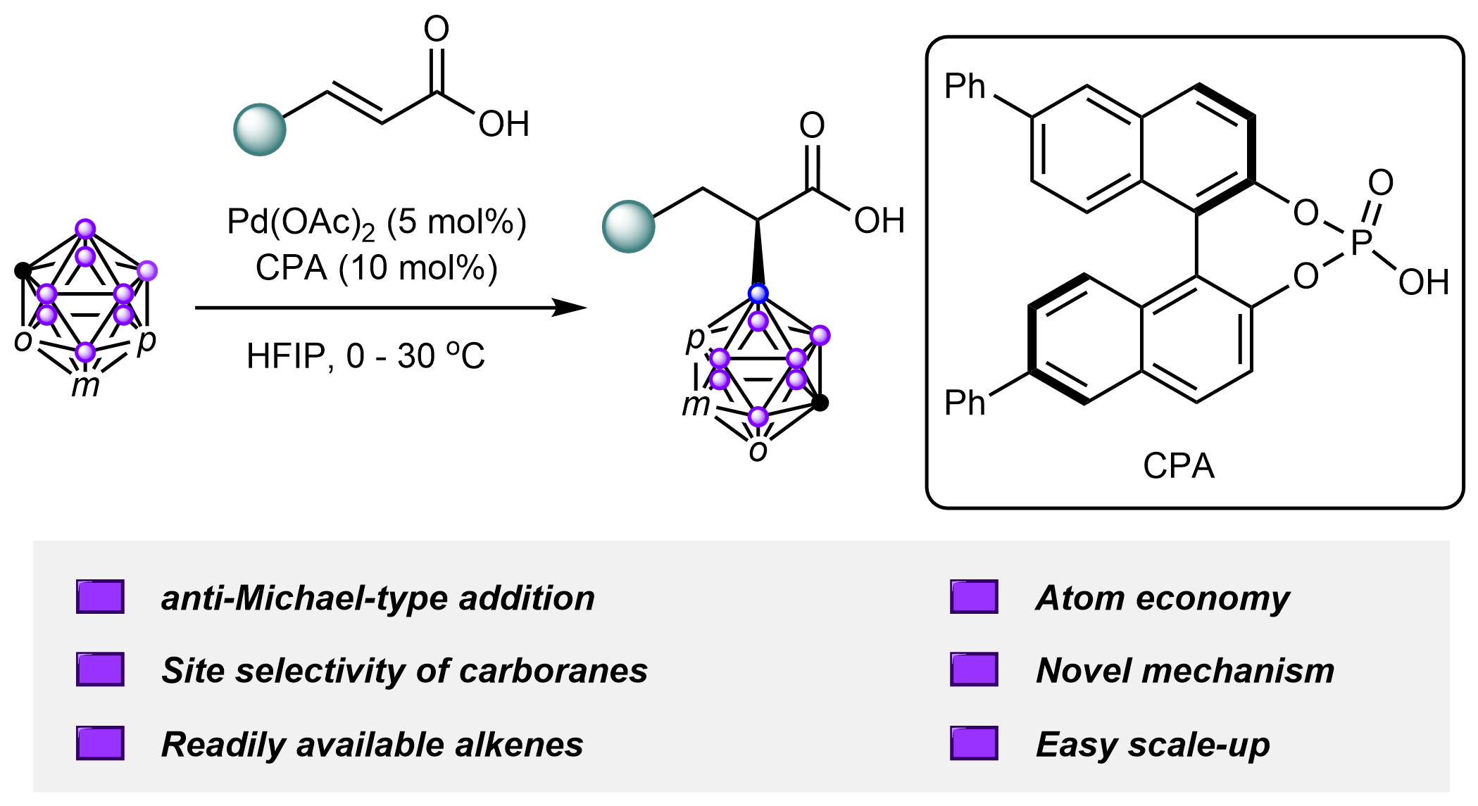 近日,bat365在线中国官网登录入口化学学院在碳硼烷不对称B-H键活化研究领域取得积极进展。该研究利用钯/手性磷酸协同催化策略,创新性地实现了碳硼烷对α,β-不饱和羧酸的不对称反Michael加成,即碳硼烷加成在了羧基的α位。