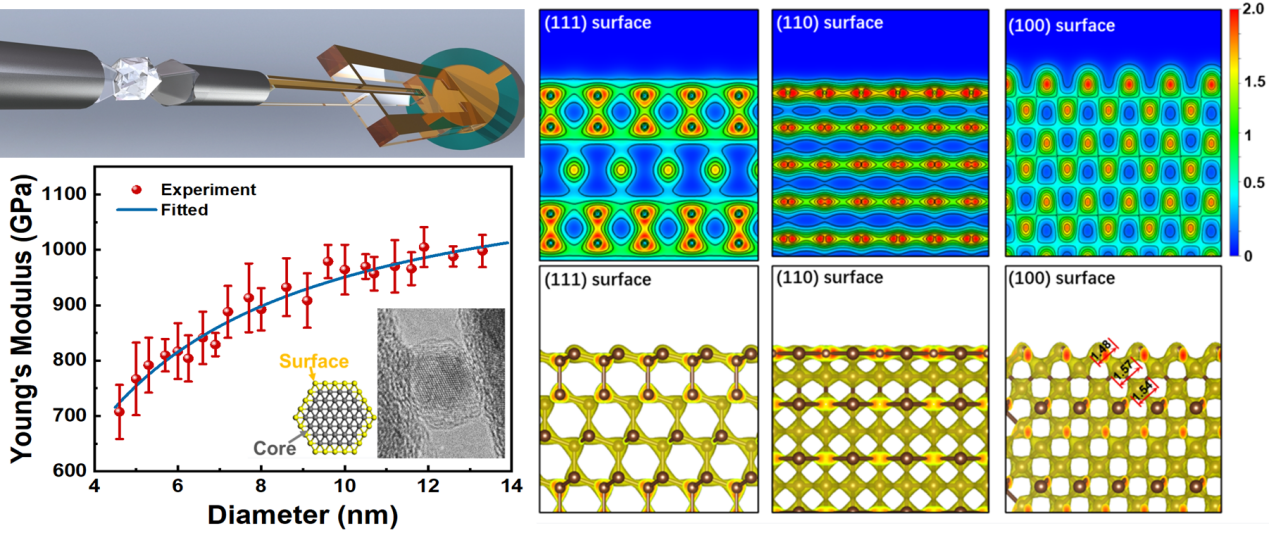 纳米金刚石杨氏模量随尺寸的变化曲线,及表面/亚表面的电子分布模拟图
