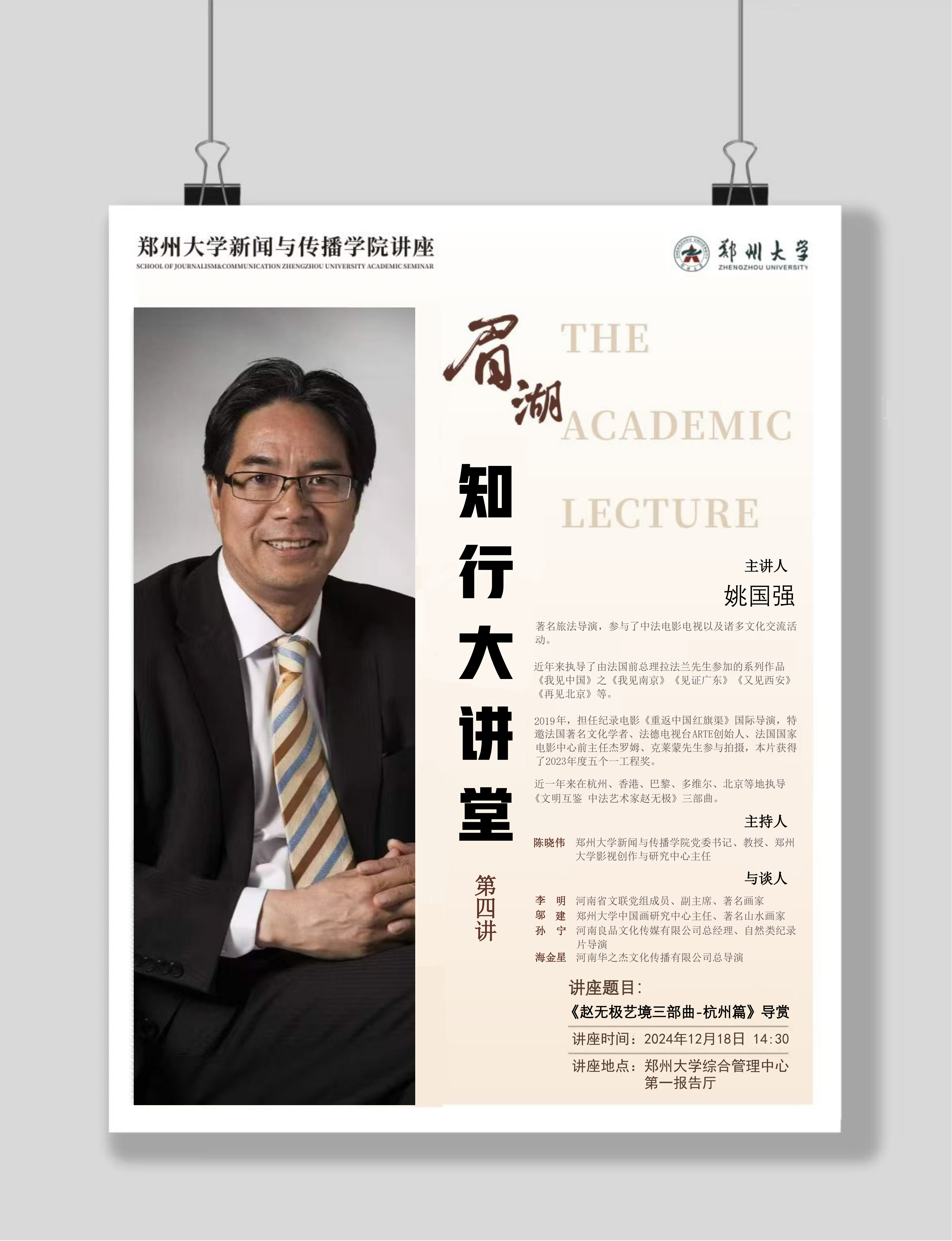 bat365在线中国官网登录入口新闻与传播学院眉湖·知行大讲堂是一个汇集知识、人文、艺术于一体的交流平台,定位以文化人,审美向善。第四期邀请了著名旅法导演姚国强先生携纪录片作品《赵无极艺境三部曲》前来交流并做现场导赏,欢迎广大师生积极参加!