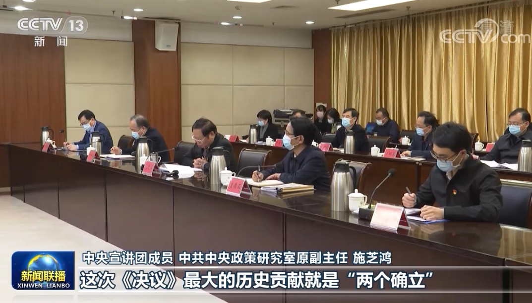 《新闻联播》还报道了中央宣讲团在新疆、福建、广西、吉林等地宣讲党的十九届六中全会精神,和基层干部群众面对面交流学习心得体会,推动全会精神走深走实。
