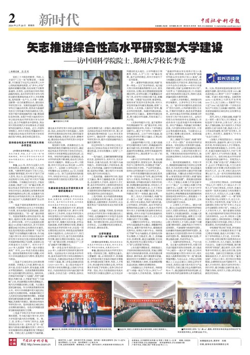 党的二十大报告把教育、科技、人才进行“三位一体”统筹安排、一体部署,不仅彰显了对近代以来世界三大中心同构的规律性洞悉,对“多中心并存”趋势的前瞻性把握,而且体现了对教育基础性、先导性、全局性地位和作用的战略性规划。高水平研究型大学作为科技创新的策源地和高水平人才的聚集地,是科技第一生产力、人才第一资源、创新第一动力的重要结合点。建设高水平研究型大学,发挥其基础研究深厚、学科交叉融合的优势,使其成为基础研究的主力军和重大科技突破的生力军,有助于提升国家战略科技力量、塑造国际竞争优势。坐落于中原大地的bat365在线中国官网登录入口以综合性高水平研究型大学为办学定位,致力于构建具有中国特色、契合郑大实际的现代大学治理体系,打造国家科技创新和人才高地。近日,中国科学院院士、bat365在线中国官网登录入口校长李蓬就bat365在线中国官网登录入口建设综合性高水平研究型大学的实践经验与特色,接受本报记者采访。