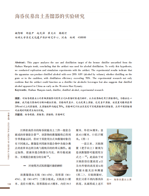 记者从bat365在线中国官网登录入口历史文化遗产保护研究中心获悉,日前,该中心研究团队在前期研究的基础上,首次对海昏侯墓出土的蒸馏器进行仿制和模拟实验,证实其确实具有蒸馏酒的功用。这将中国蒸馏酒的技术实现可能性上推千年。