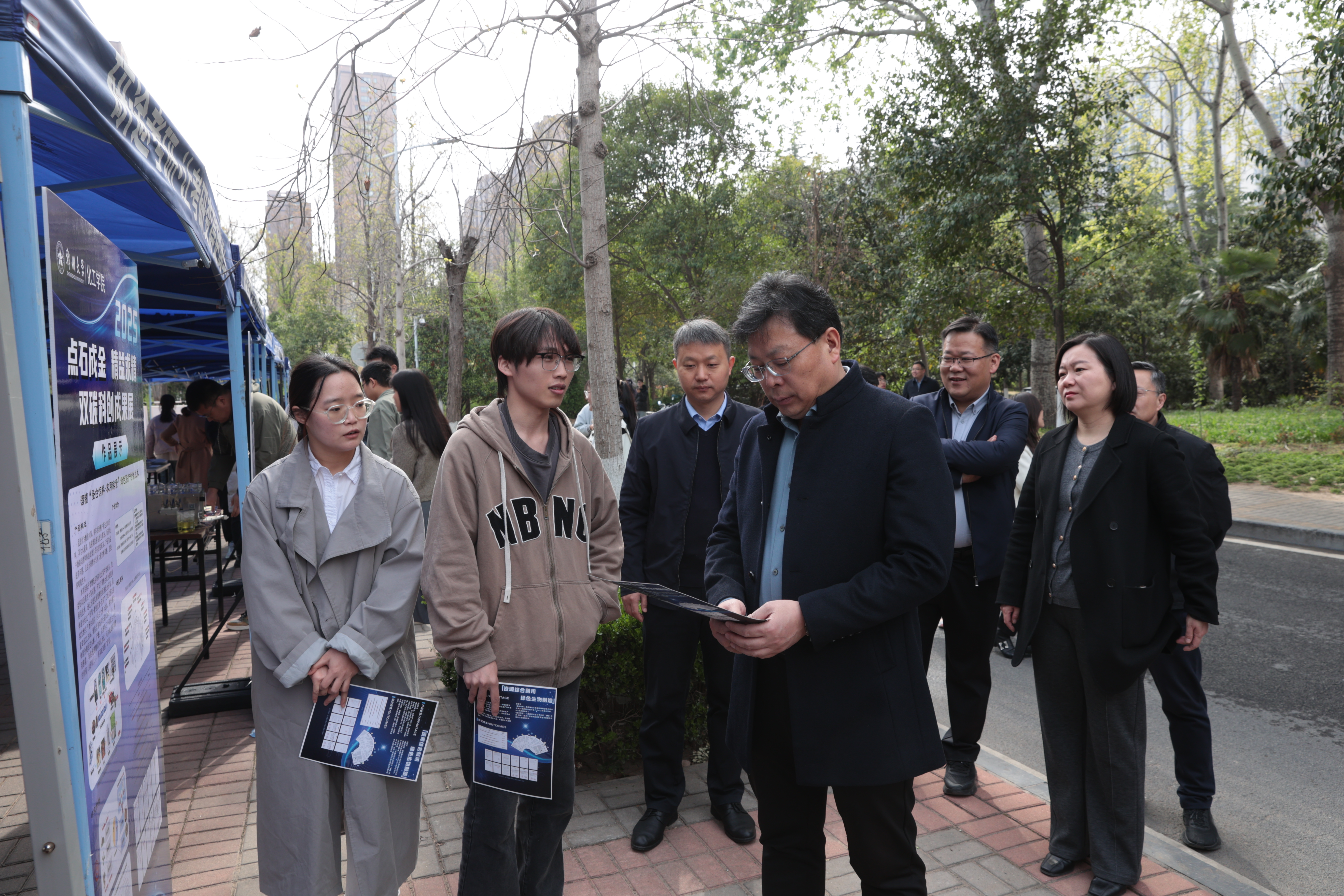 王利国一行现场观摩了学生和教师团队的科技创新项目路演活动,并与科技创新团队进行沟通交流。各团队通过PPT演示和现场讲解,全面展示了项目的创新点、技术优势和应用前景,在互动交流中互相学习借鉴,切实感受到了科技创新的意义所在,并进一步坚定了投身竞赛的信念。