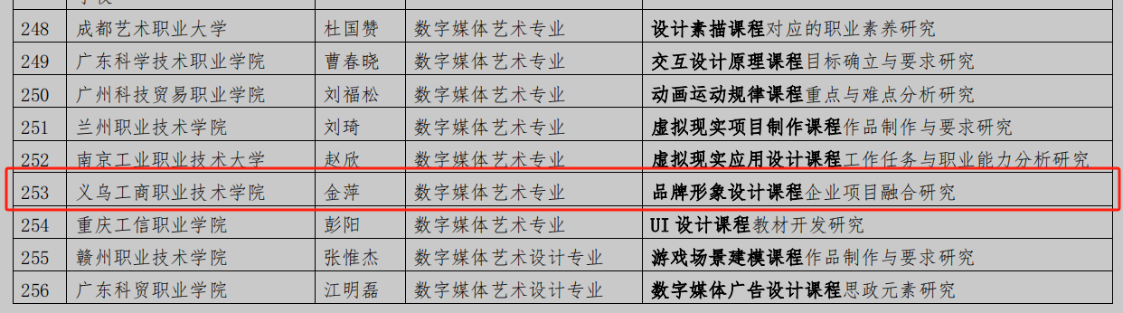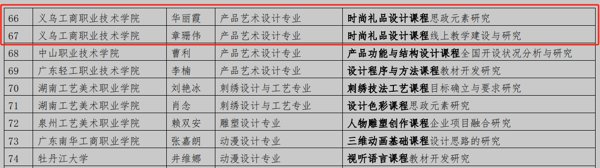 近日,教育部职业院校艺术设计类专业教学指导委员会公布了首批职业教育艺术设计类课程标准开发专项课题具体名单。beat365教师华丽霞主持的《时尚礼品设计课程思政元素研究》、金萍主持的《品牌形象设计课程企业项目融合研究》、章珊伟主持的《时尚礼品设计课程线上教学建设与研究》课题,均经过严格评审,成功获批立项。