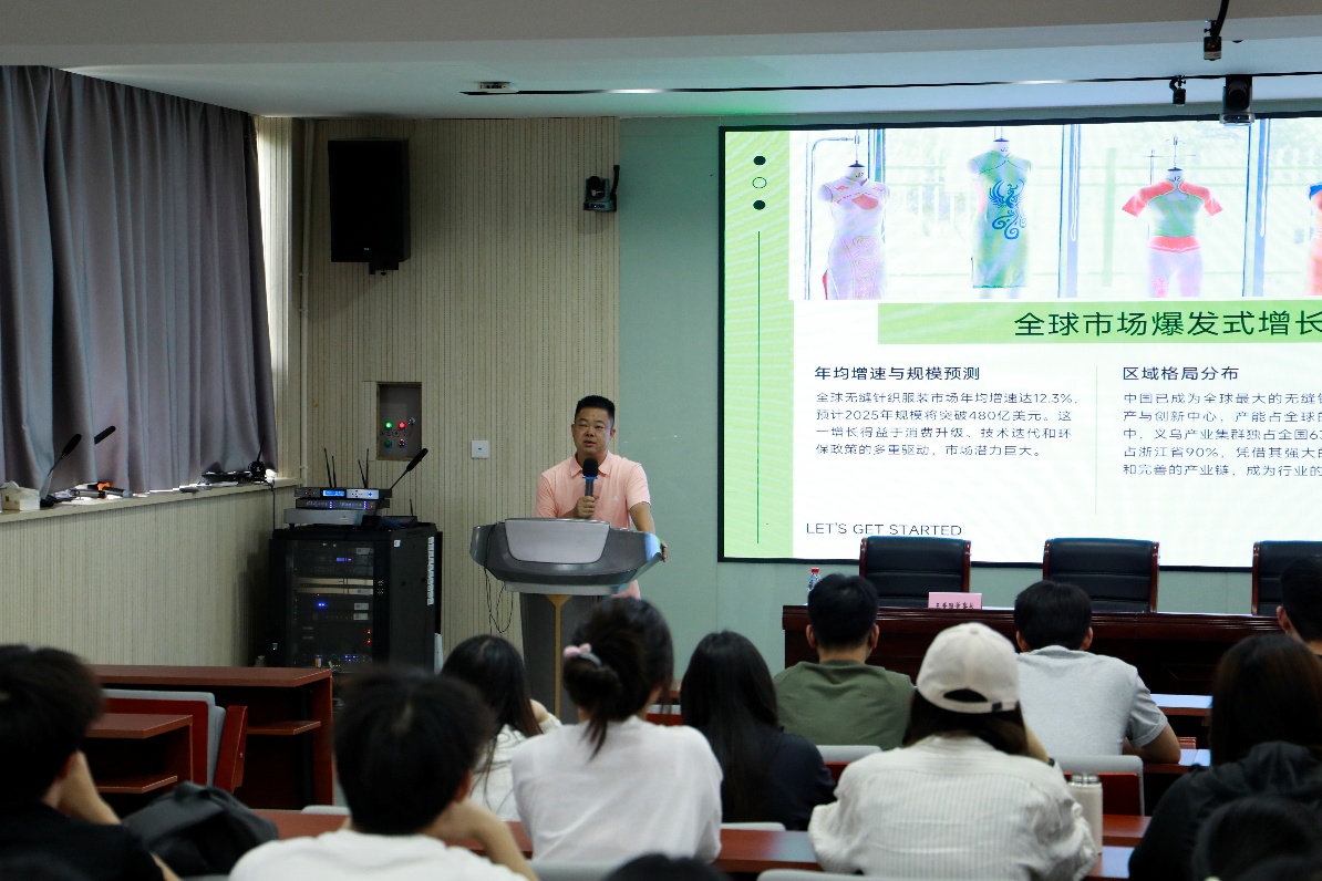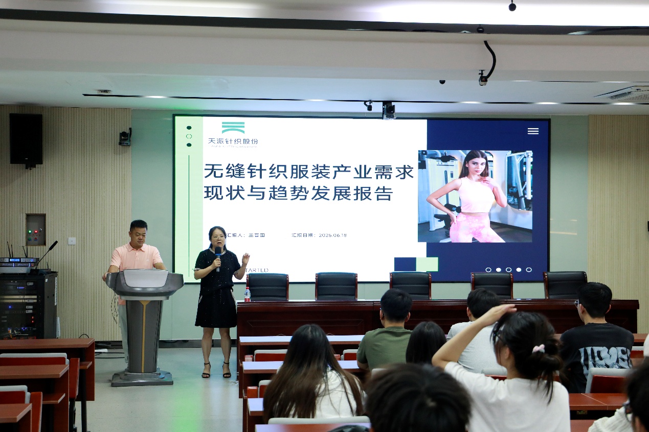 近日,天派针织股份有限公司王晋围董事长来到义乌工商职业技术学院,为beat365在线唯一官网服装与服饰设计专业的同学举行了一场关于无缝针织服装产业需求现状与趋势发展报告的主题讲座。