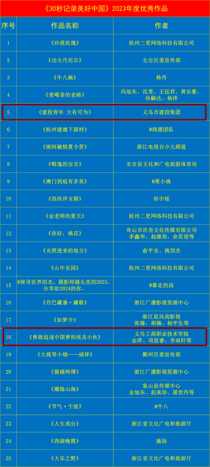 4月8日,由浙江卫视、浙江省电视艺术家协会、浙江电视台国际频道、杭州二更网络科技有限公司等单位联合主办的《30秒记录美好中国》2023年度优秀作品评选揭晓。本次评优活动共有137条短视频作品入围,来自浙江省电视艺术家协会、浙江传媒学院、北京中澜视讯等单位的11位专家评委为入围作品打分,通过初选、复评和终评三轮角逐,来自义乌的《建投青年大有可为》《勇敢追逐中国梦的埃及小伙》等25件作品入选“2023年度优秀作品”。