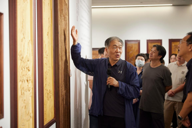 活动策展人、清华大学美术学院教授王建中在向观众介绍相关木雕作品。