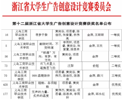 “全国大学生广告艺术大赛”是由教育部高等教育司指导,中国高等教育学会、教育部高等学校新闻传播学类专业教学指导委员会共同主办的全国高校文科学科竞赛,是迄今为止全国规模最大、覆盖高等院校广、参与师生人数最多、作品水准和质量高的国家级大学生赛事。全国大学生广告艺术大赛浙江赛区的竞争也是非常激烈的,这次浙江省第十二届大学生广告创意设计竞赛,主赛道共有获奖作品1669件。经评审组专家的评审,此次常规赛道中平面类共评出一等奖 49项、二等奖75项、三等奖123项。视频类微电影广告共评出一等奖15项、二等奖 24项、三等奖 40项。我校学子积极参与并在这些作品中成功脱颖而出,再创佳绩!