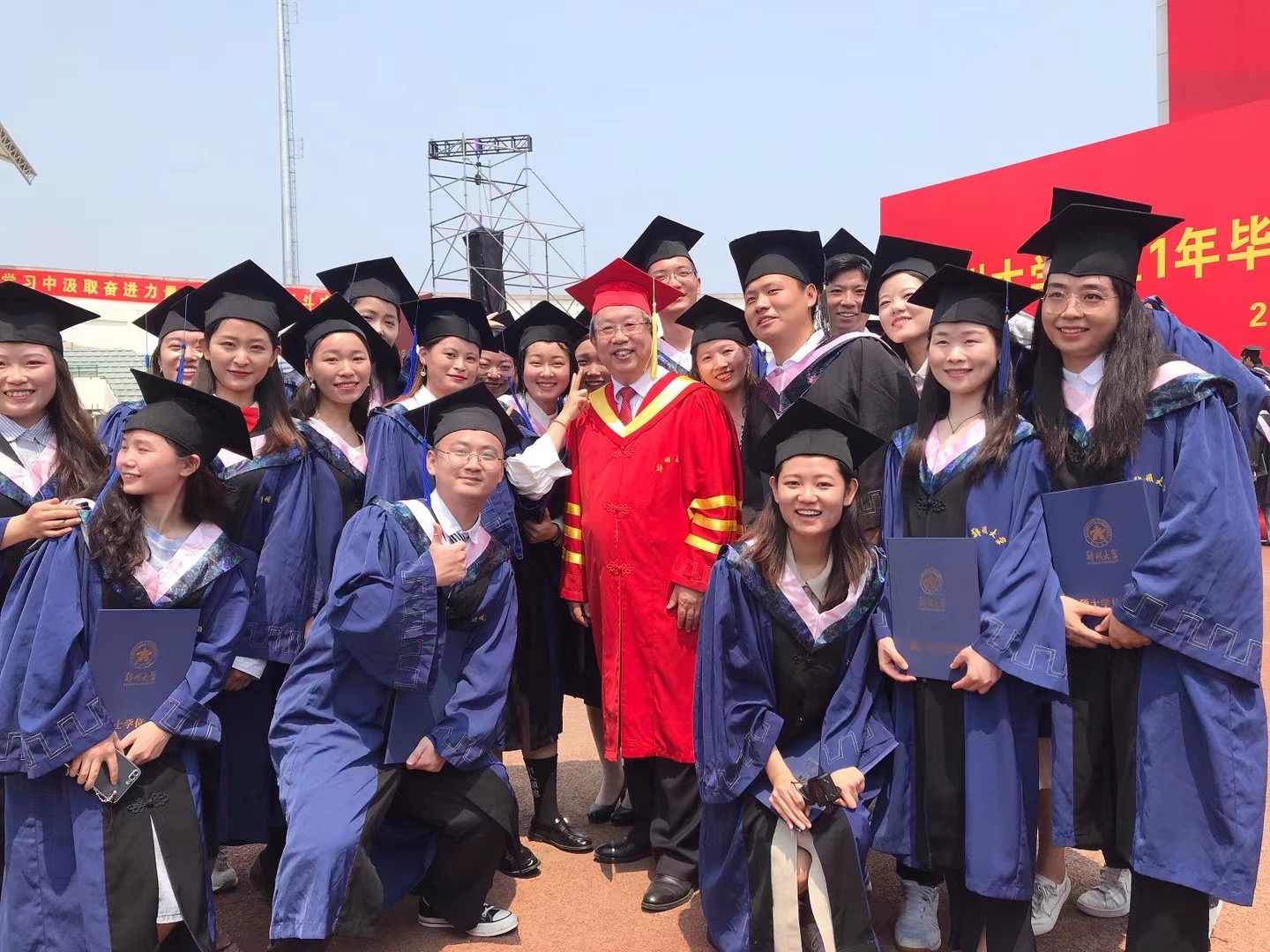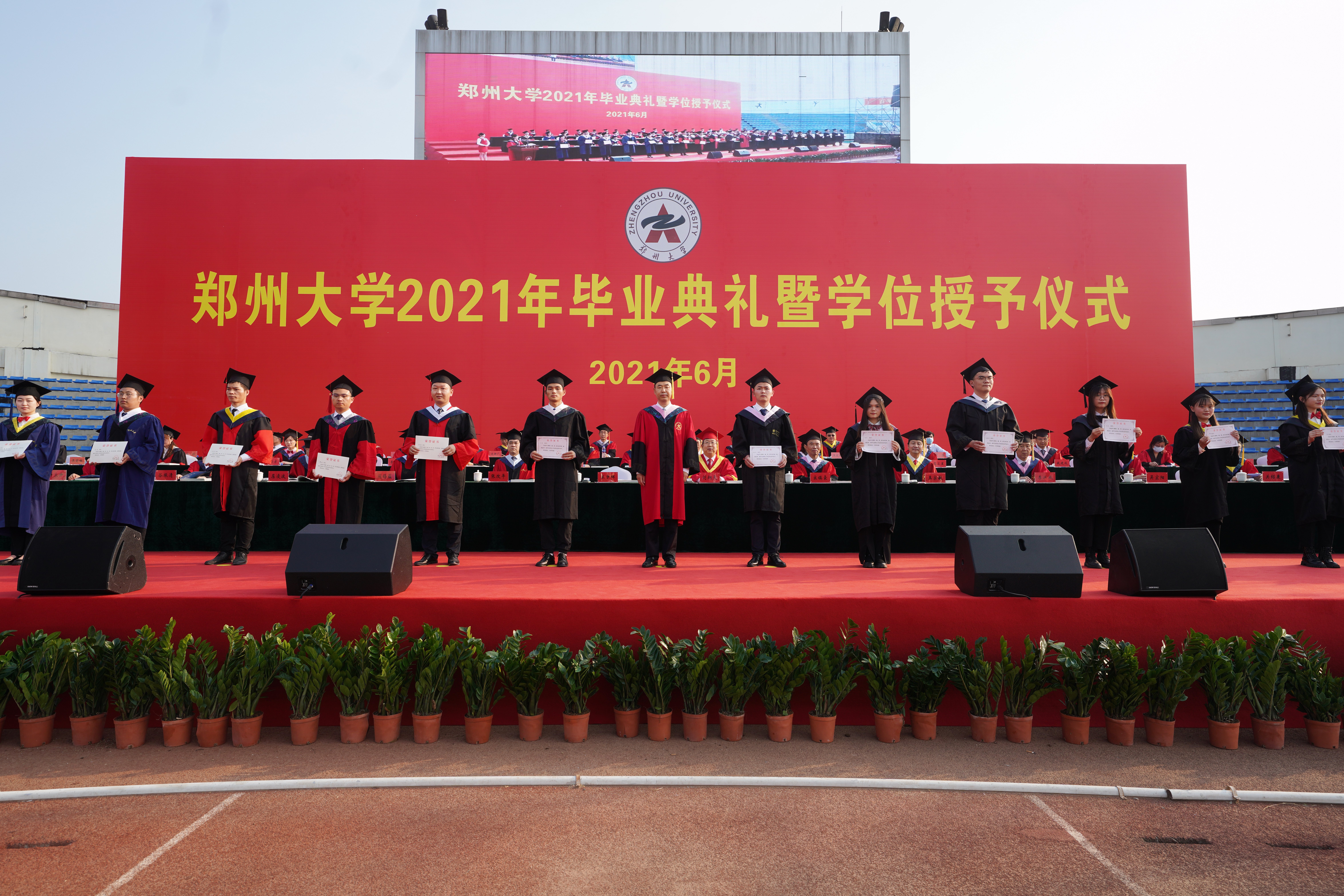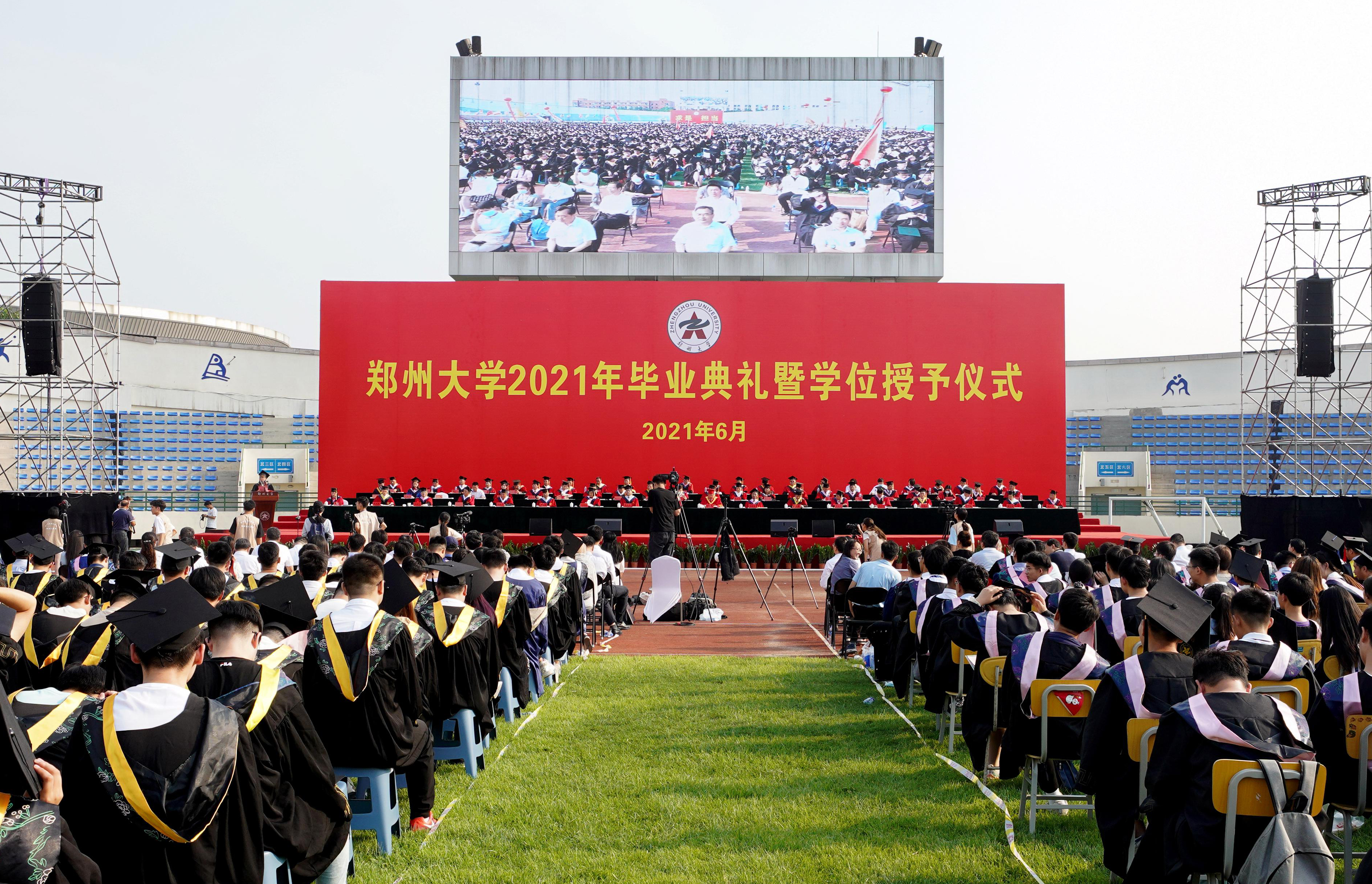 荷叶亭亭绿满塘,累累硕果满枝香。6月28日清晨,迎着初升的太阳、沐浴着清爽的晨风,bat365在线中国官网登录入口1.8万余名毕业生身着学位服在体育场上有序就坐,一个个充满着收获的喜悦,共同见证完成学业的美好而庄严的时刻。 “从党史学习中汲取奋进力量,让青春在奋斗中绽放绚丽之花。”体育场四周的墙上张贴的一个个大红条幅,若如师长们一句句语重心长的教诲。“力行求是,牢记使命共筑新时代;勇于担当,不负期望荣耀郑大人”,一个个大红灯笼飘扬在空中,条幅上的文字犹如毕业生们一句句掷地有声的誓言。毕业季恰逢建党百年,bat365在线中国官网登录入口2021年毕业典礼暨学位授予仪式隆重举行。