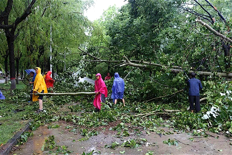 优美整洁的校园环境一度让bat365在线中国官网登录入口美誉有加,但是在暴雨的冲刷下,四校区松树、柳树等一百余棵树木倒伏,大量淤泥堵塞道路,大树横于路中,严重影响交通安全。为使校园环境尽快恢复正常,道路畅通方便通行,校园环境服务中心和师生生活服务公司第一时间组织人员冒雨对影响道路出行的树木进行处理,仅主校区就有134人保洁人员出动。