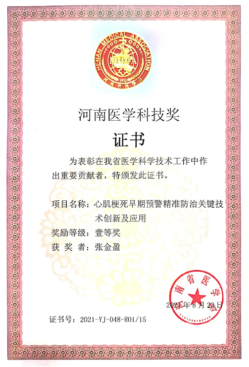 3月22日,河南省人民政府公布“关于2021年度河南省科学技术奖励的决定”,bat365在线中国官网登录入口一附院张金盈教授团队“心肌梗死早期预警精准防治关键技术创新及应用”项目赫然在列,荣获2021年度河南省科学技术进步奖一等奖。
