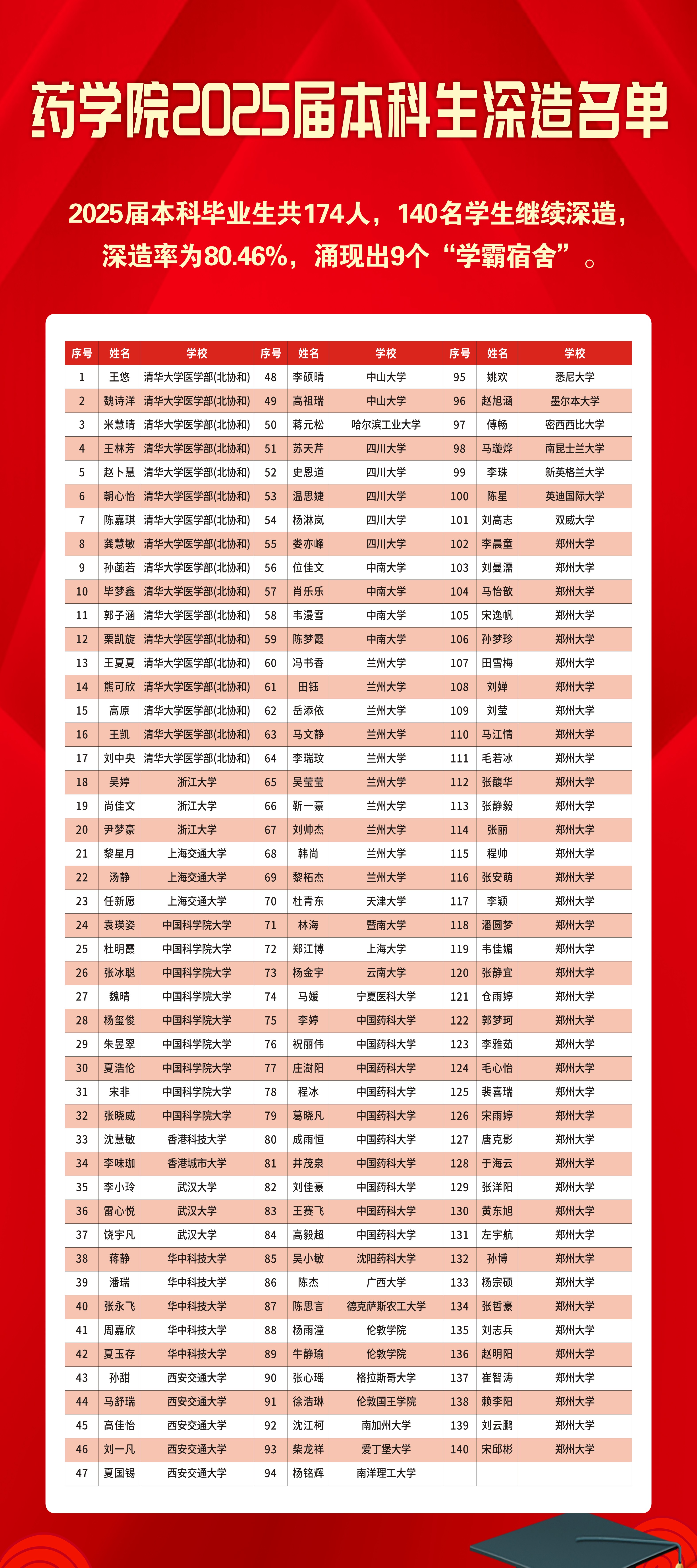 2025年毕业季如约而至,学子们纷纷告别母校,他们的去向也成为焦点。bat365在线中国官网登录入口药学院2025届本科应届毕业生升学深造收获喜人成果。全院本科毕业生174人,其中140人被国内外高校录取,深造率达到80.46%,涌现出9个“学霸宿舍”,创下学院历史新高。其中,仅清华大学医学部(北京协和医学院)就有17人。这背后藏着怎样的故事?让我们走进药学院,共同探寻优秀背后的“秘密”。
