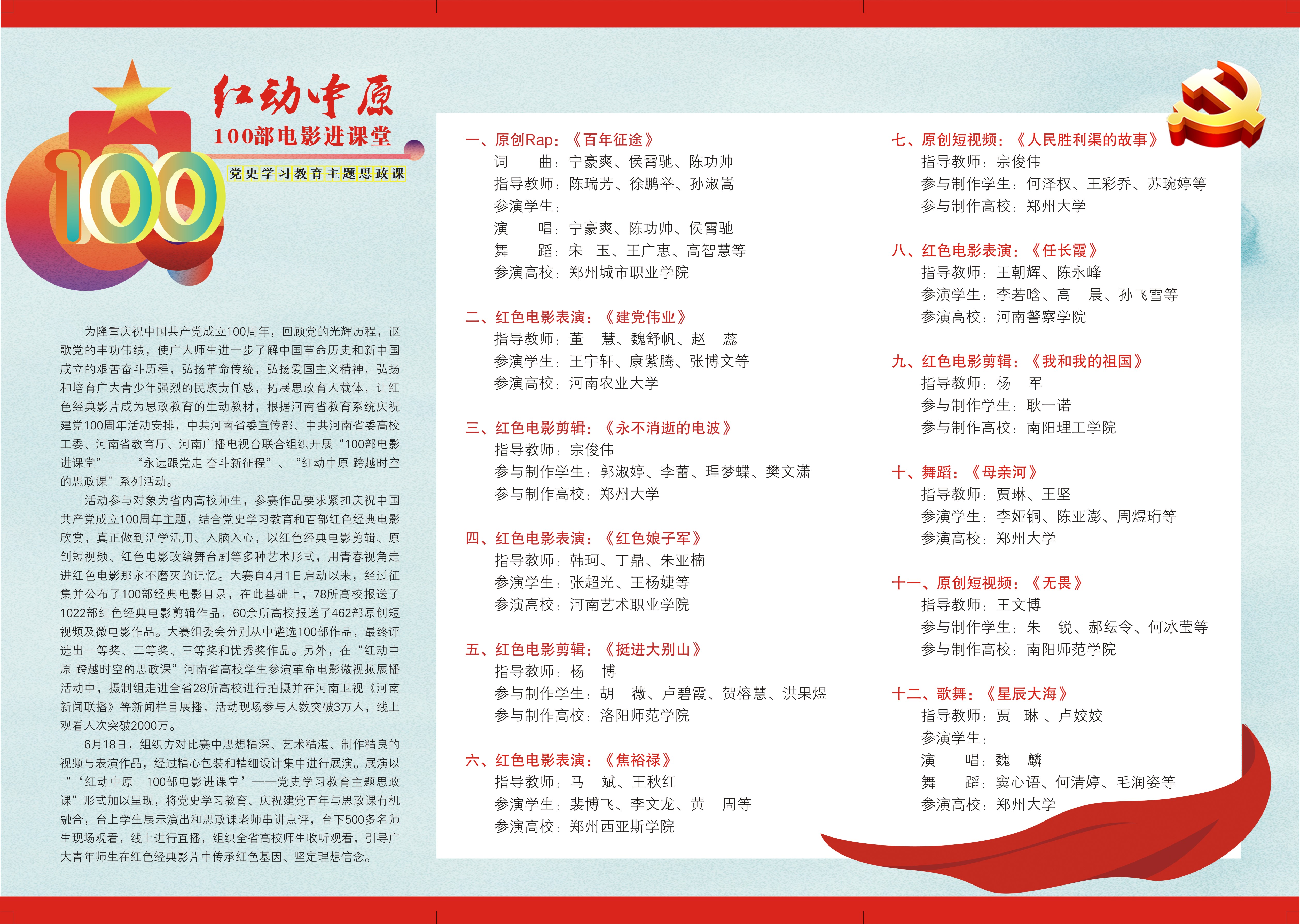 为庆祝中国共产党成立100周年,推动党史学习教育入脑入心,拓展思政育人载体,由省委宣传部、省委高校工委、省教育厅、河南广播电视台主办,bat365在线中国官网登录入口等单位承办的“红动中原·100部电影进课堂”党史学习教育主题思政课将于今晚(6月18日)19:00-21:00在南校区学习堂举行。