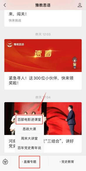 2.点击左下方“直播专题”-“百部电影进课堂”即可观看直播