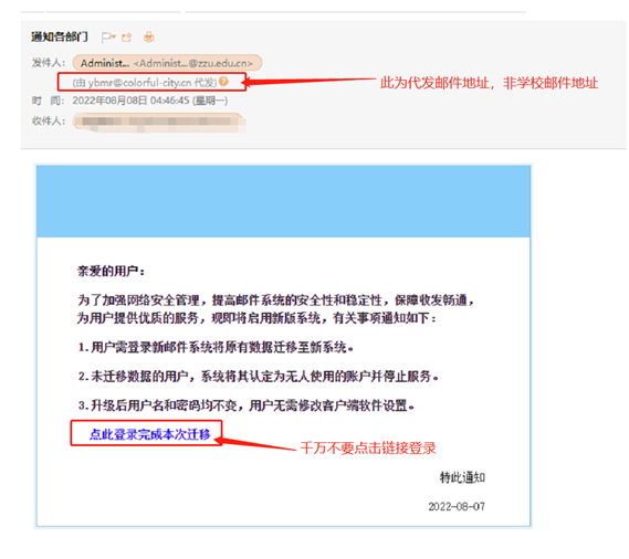 近日我校部分邮件用户再次收到钓鱼邮件,邮件标题为“通知各部门”,邮件内容大致为“为了加强网络安全管理,提高邮件系统的安全性和稳定性,保障收发畅通,为用户提供优质的服务,现即将启用新版系统,有关事项通知如下:……点此登录完成本次迁移”。其中的链接地址均为钓鱼网站,若登录可导致用户名和密码泄露。