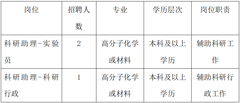 1、高分子化学、材料等相关专业本科及以上学历;