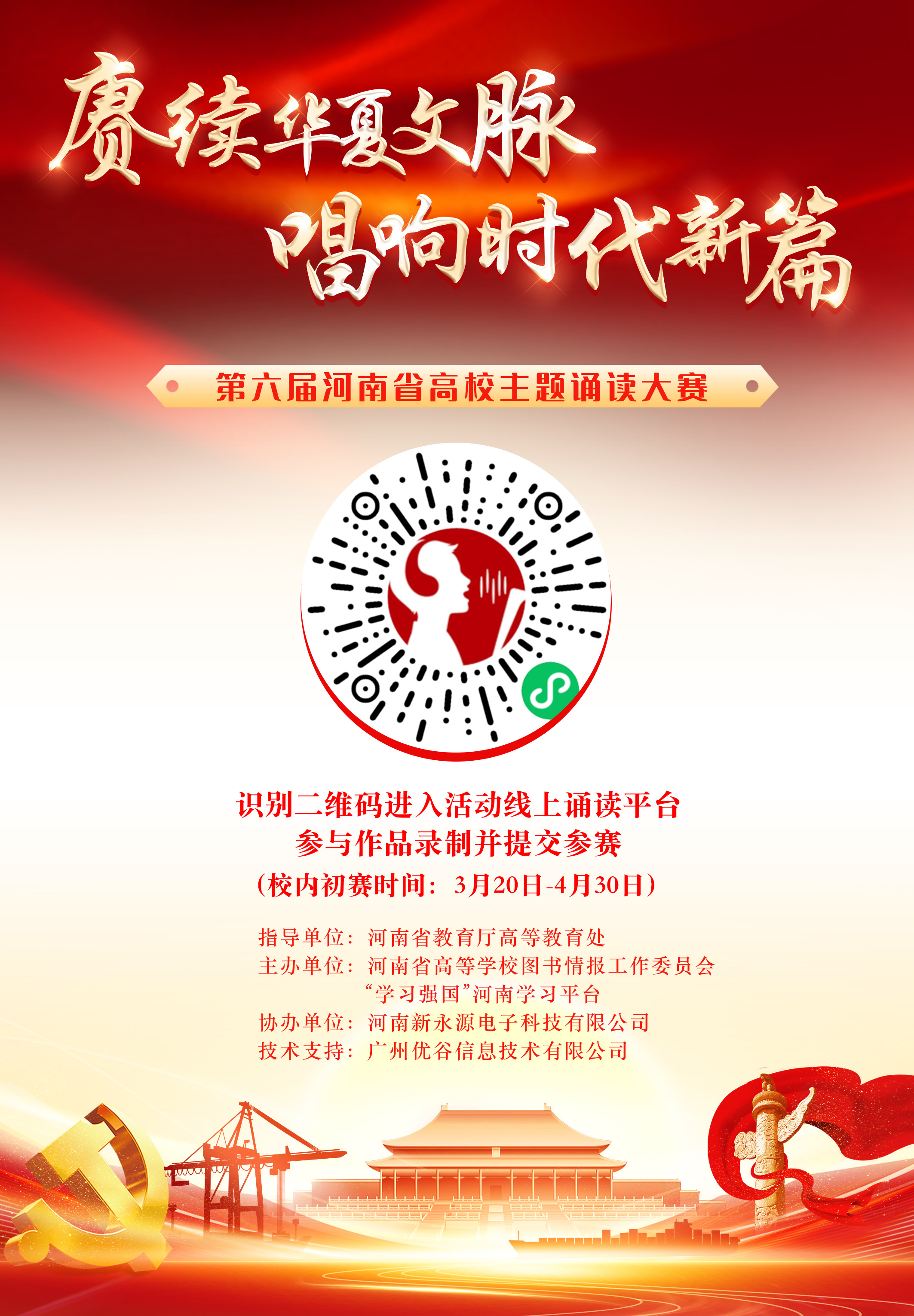 为深入贯彻落实党的二十大和二十届二中、三中全会精神与河南省委宣传部《2025 年书香河南建设工程实施方案》的部署要求,进一步加快构建学习型社会,践行“推动中华优秀传统文化创造性转化、创新性发展”的时代使命,深化弘扬社会主义核心价值观教育,建设书香河南,丰富校园文化。特举办“赓续华夏文脉·唱响时代新篇”主题诵读大赛。