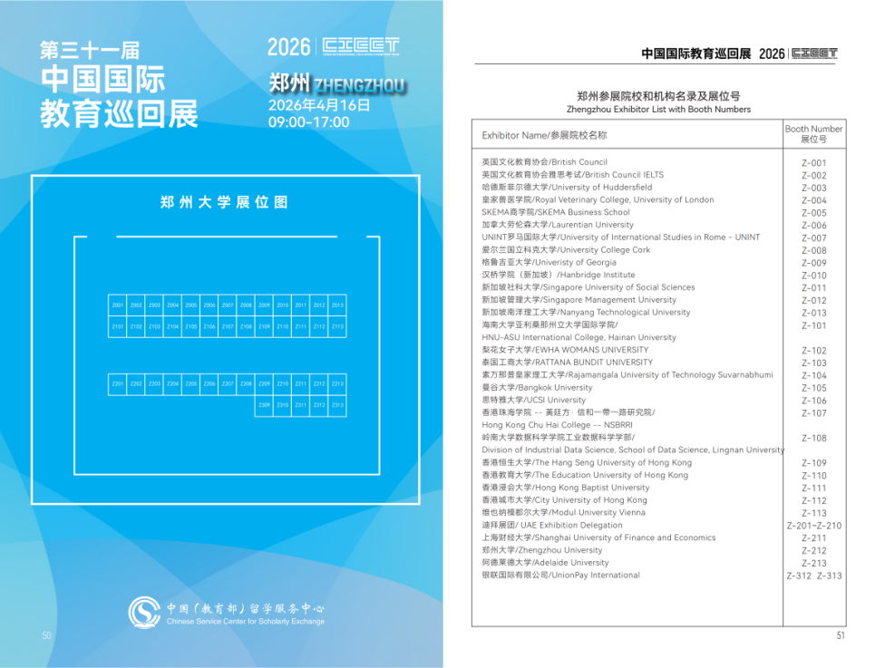 为提升国际化办学水平,拓宽师生国际视野,同时为中原地区广大学生和家长搭建权威、便捷的国际教育交流平台,由中国(教育部)留学服务中心主办、bat365在线中国官网登录入口承办的“2026中国国际教育巡回展(郑州站)”将于4月16日在我校主校区举行。届时将有来自全球20余个国家和地区的近百所顶尖院校及教育机构齐聚郑大,带来一场集留学咨询、平安留学、学历认证、就业指导于一体的“全周期”服务盛宴。